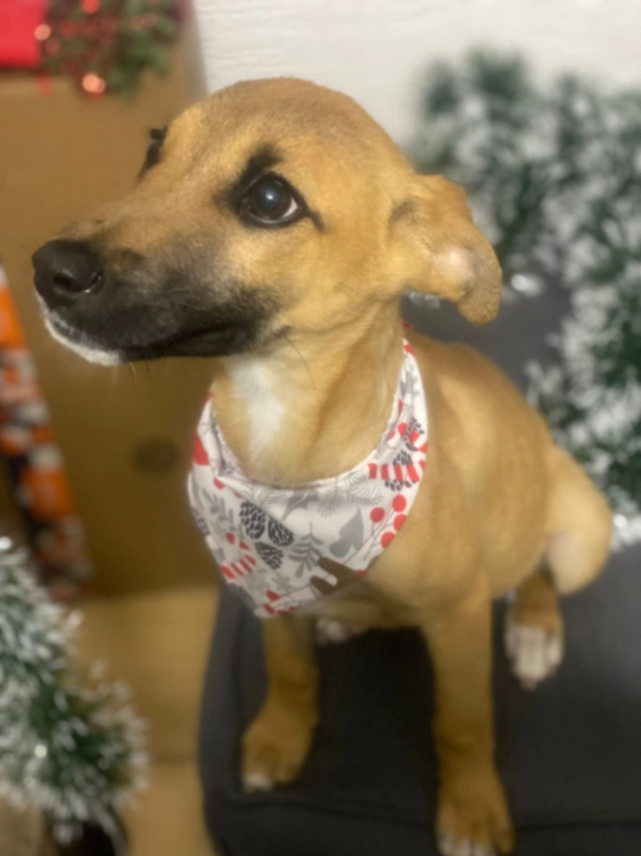 Es raza mediana, tiene cola corta, la cabeza es cafe y manches negras en el cuerpo.