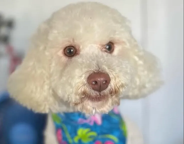 White mini-poodle, wearing a Hawaiian pattern collar. She is a rescue and is very skittish and doesn't trust easily. She is mircochiped and we reported her lost with the registry.