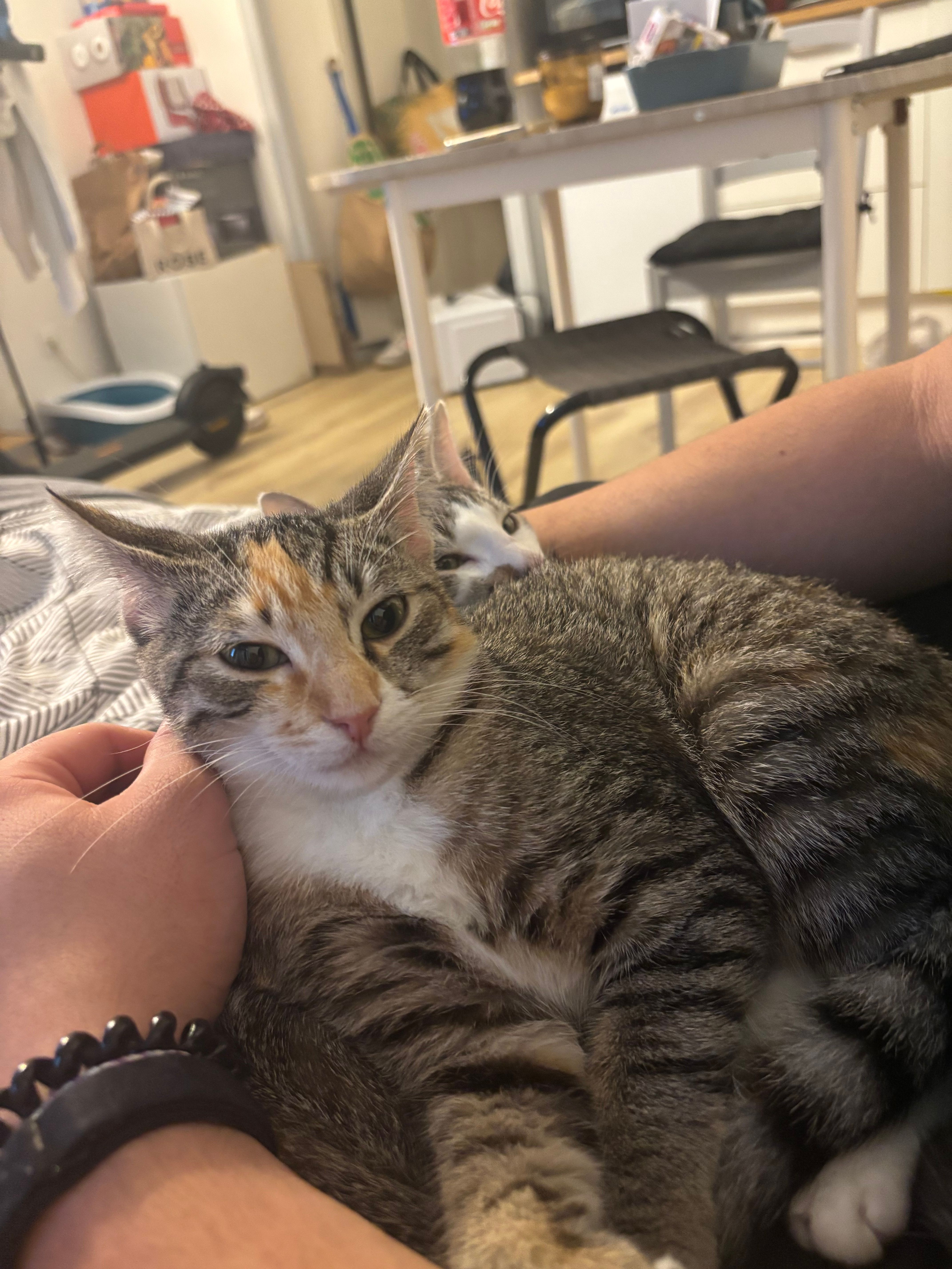 Elle s’appelles Blum, c’est une petite femelle stérilisée qui est assez peureuse.. elle a 8 mois et est très gourmande il est possible de l’attirer avec de la pâté ou des friandises. Merci de me contacter au 07.49.38.82.14 au cas où vous la trouveriez.