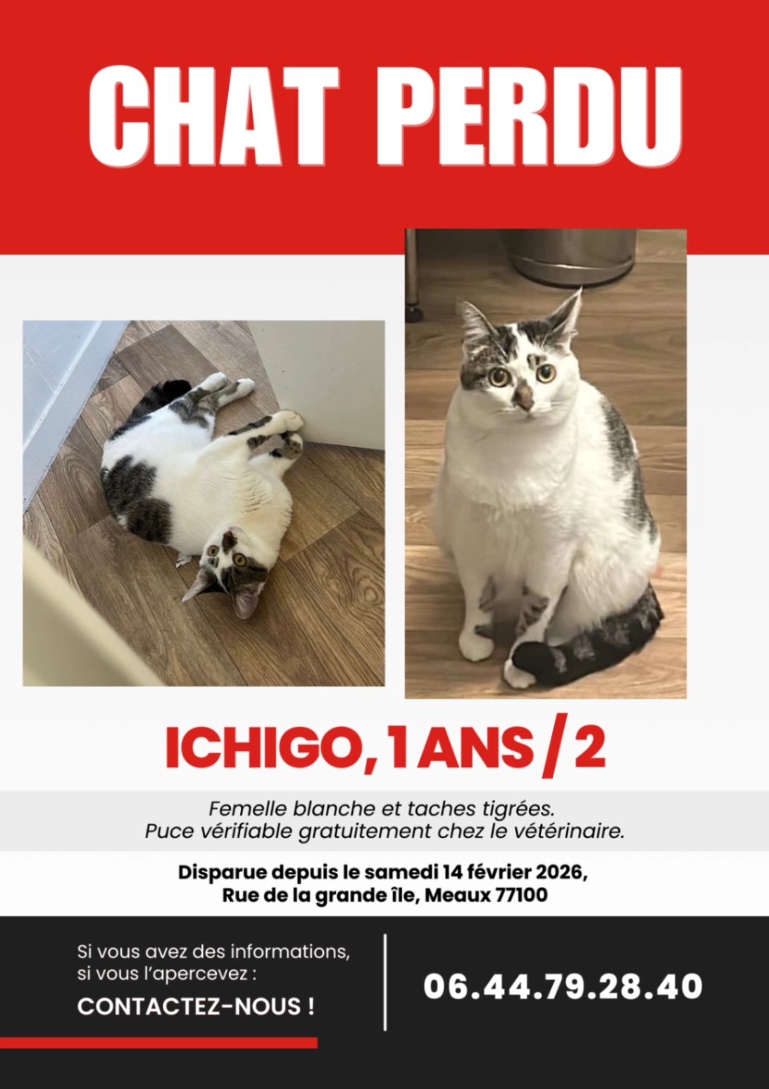 LutèceRetrouvé(e) après1sem, 2jLutèce est rentrée saine et sauve ce matin. Quel soulagement et quelle joie ! Je tiens à vous remercier pour les messages de soutien reçu. Cela nous a aidé à garder espoir et à poursuivre les actions pour l'aider à rentrer à la maison !