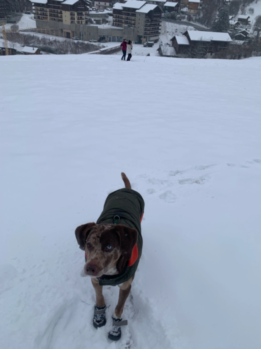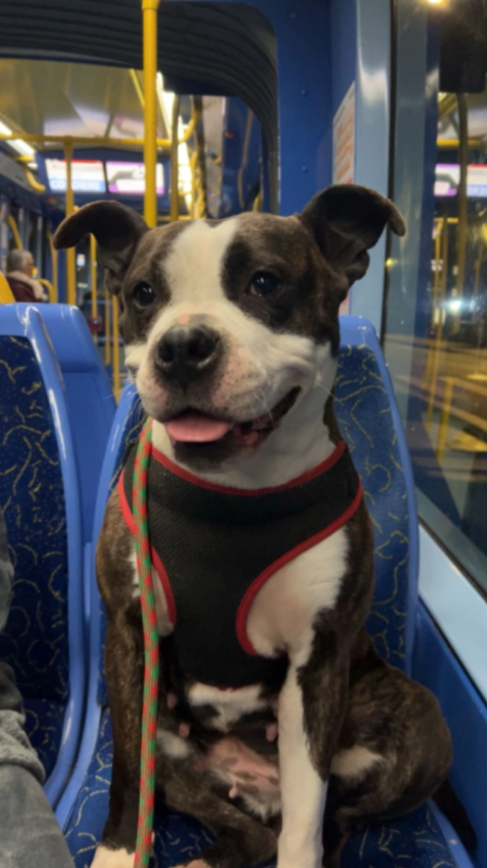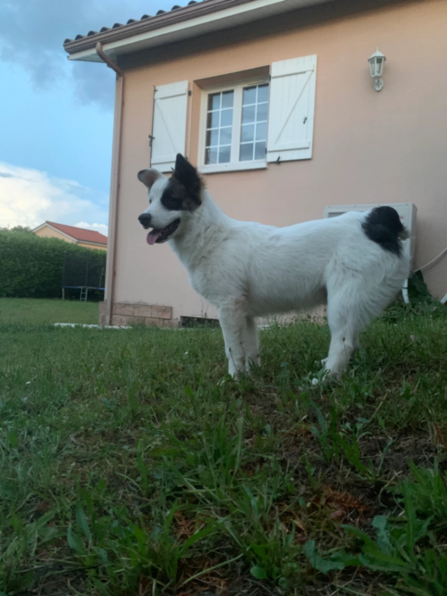 Chien blanc avec tache noir et marron âge de 2 ans. Il s’est enfuit de la crèche les halles de Lyon à st priest.