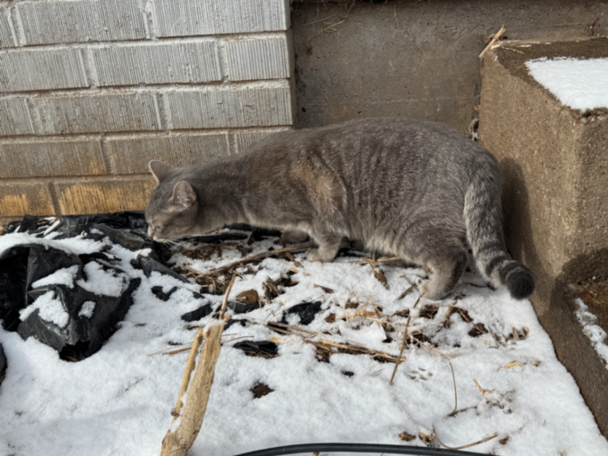 She’s a small grey and white tabby cat. She weighs about 10 pounds has large eyes and is somewhat short