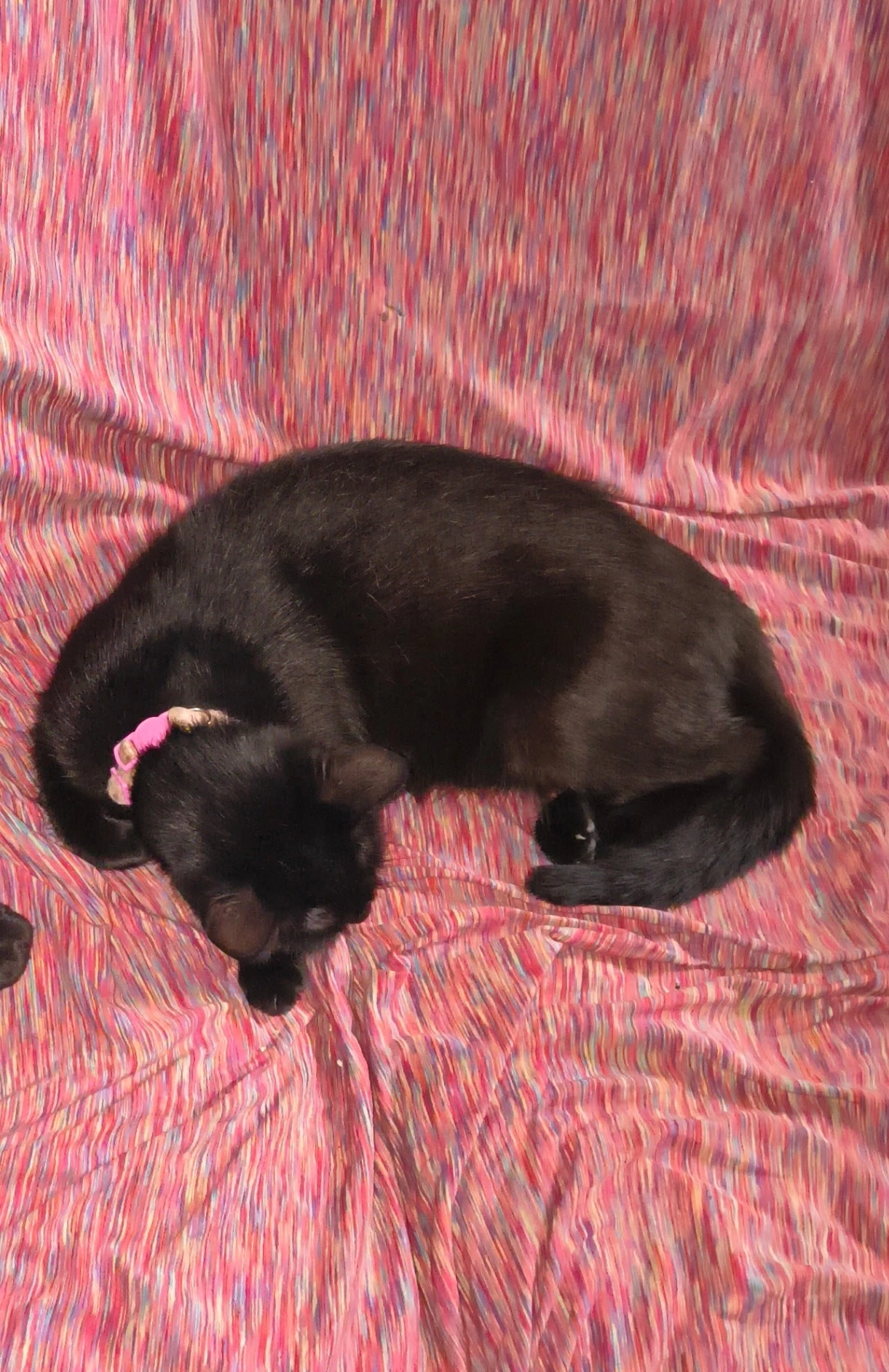 Shes all black about 6 to 7lbs has a bright pink collar on