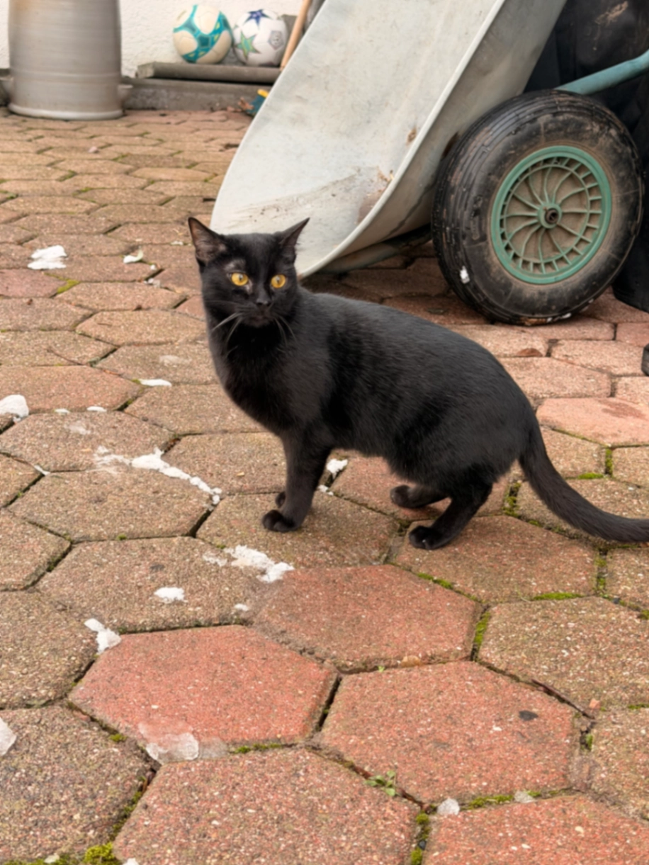 Helga ist klein, zierlich, komplett schwarz. Sie ist noch unsicher draußen und wurde von einem Kater verjagt ins Feld.
