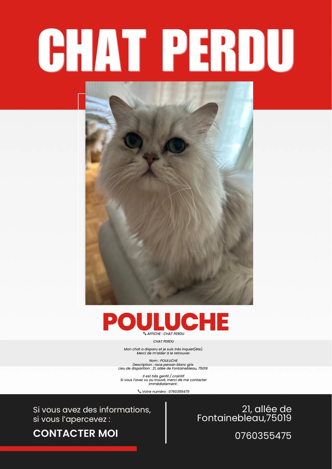 Toute information, même minime, pourra nous aider à ramener Pouluche à la maison !