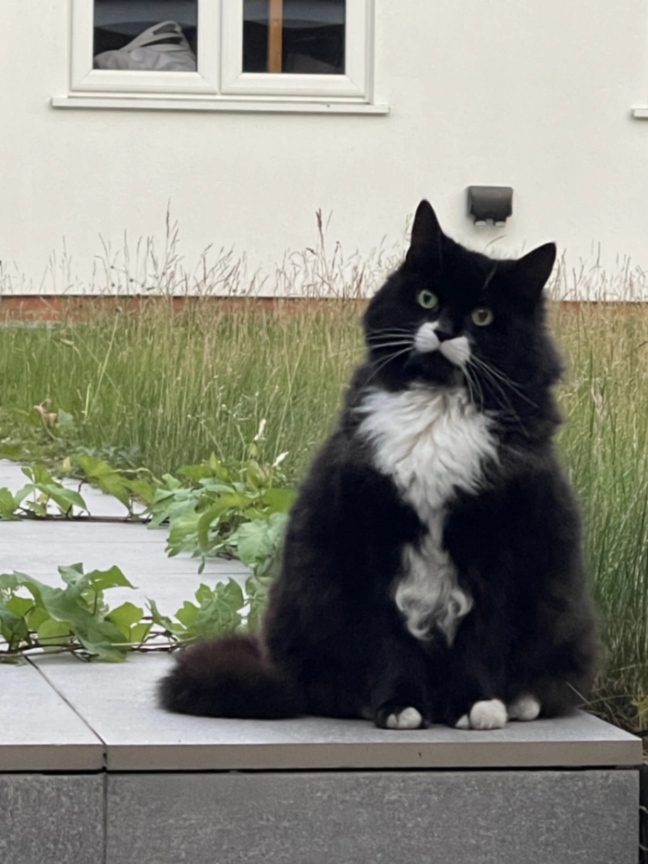He skittish cat but very sweet has spotted paes green eyes and a black spot on one of his leg is on the skinny side