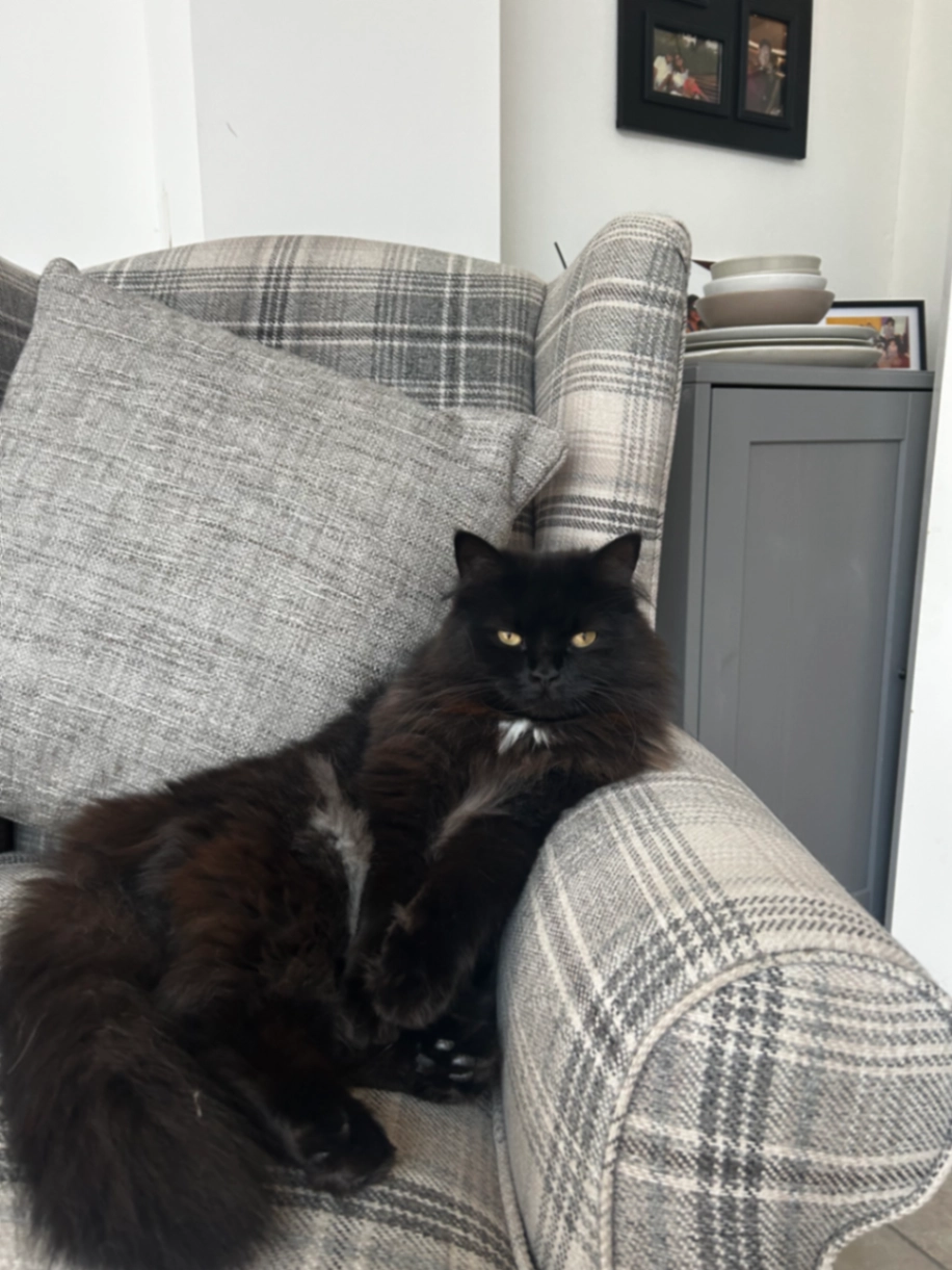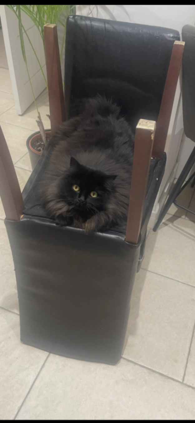 Description: Black, female, Persian Maine coon. Orange/ yellow eyes.