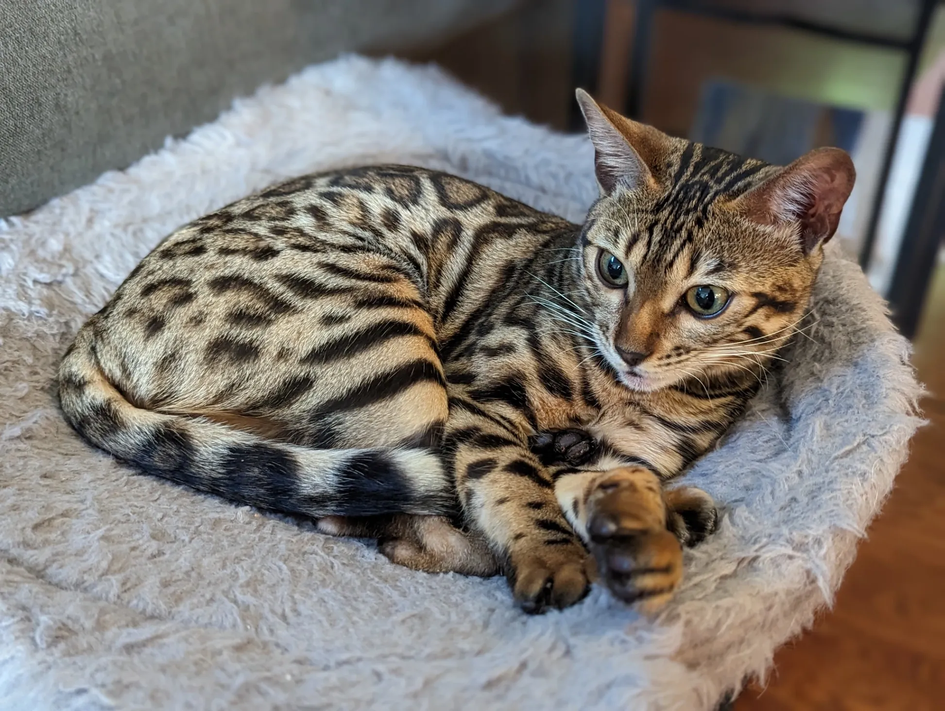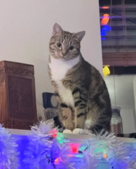 He has a bell on his collar, he is chipped which might be registered to the name Jetta, we changed it to Solstice. He has some strands of white fur on his back. In sun parts of his coat look dark burnt red, but he mostly looks like a black cat.