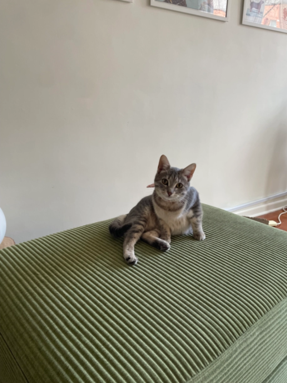 Winnie is a short hair domestic cat. She has grey fur and a cream tummy, wearing a purple collar. She is one year old and very playful and friendly. She loves food and people.