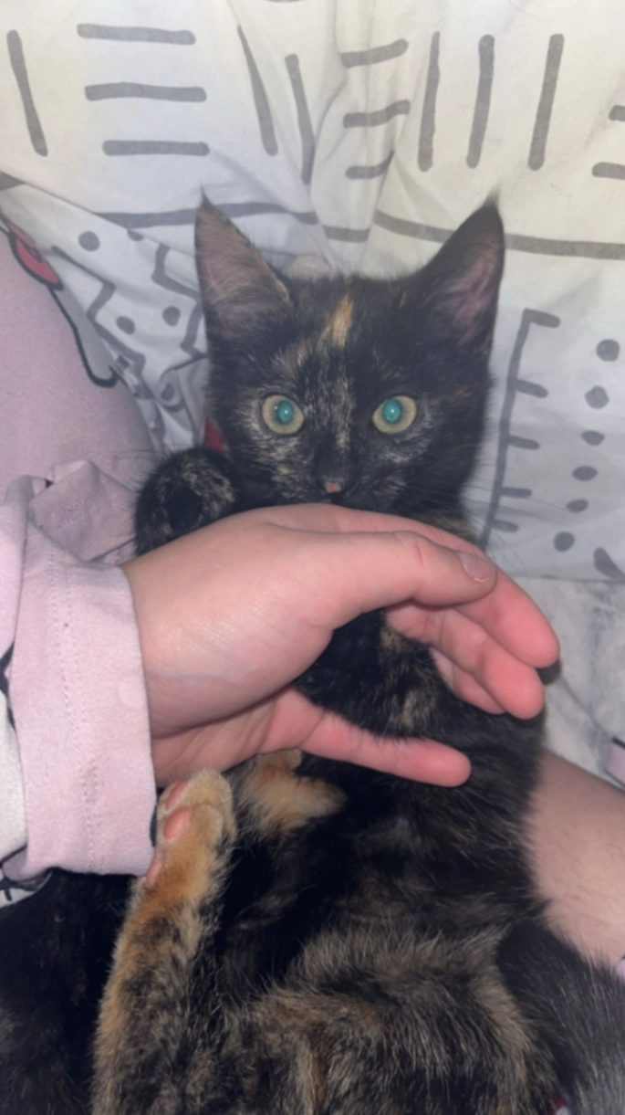 C’est un petit chaton, elle était abandonné et j’ai su la sauvé du à ça j’ai pas eu le temps d’aller la pucé elle se laisse pas facilement attraper elle a une cicatrice au niveau du nez