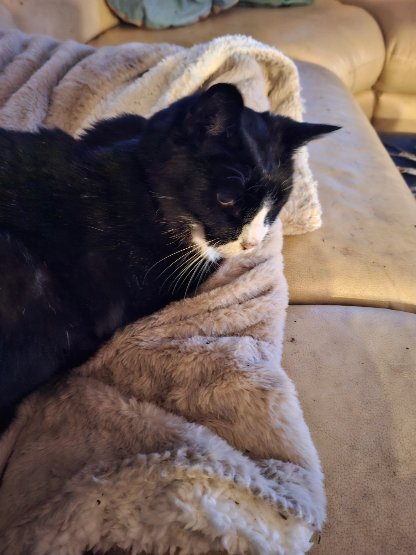 Tommy is een zwarte kater met witte pootjes, hij is niet gewoon om buiten te zijn