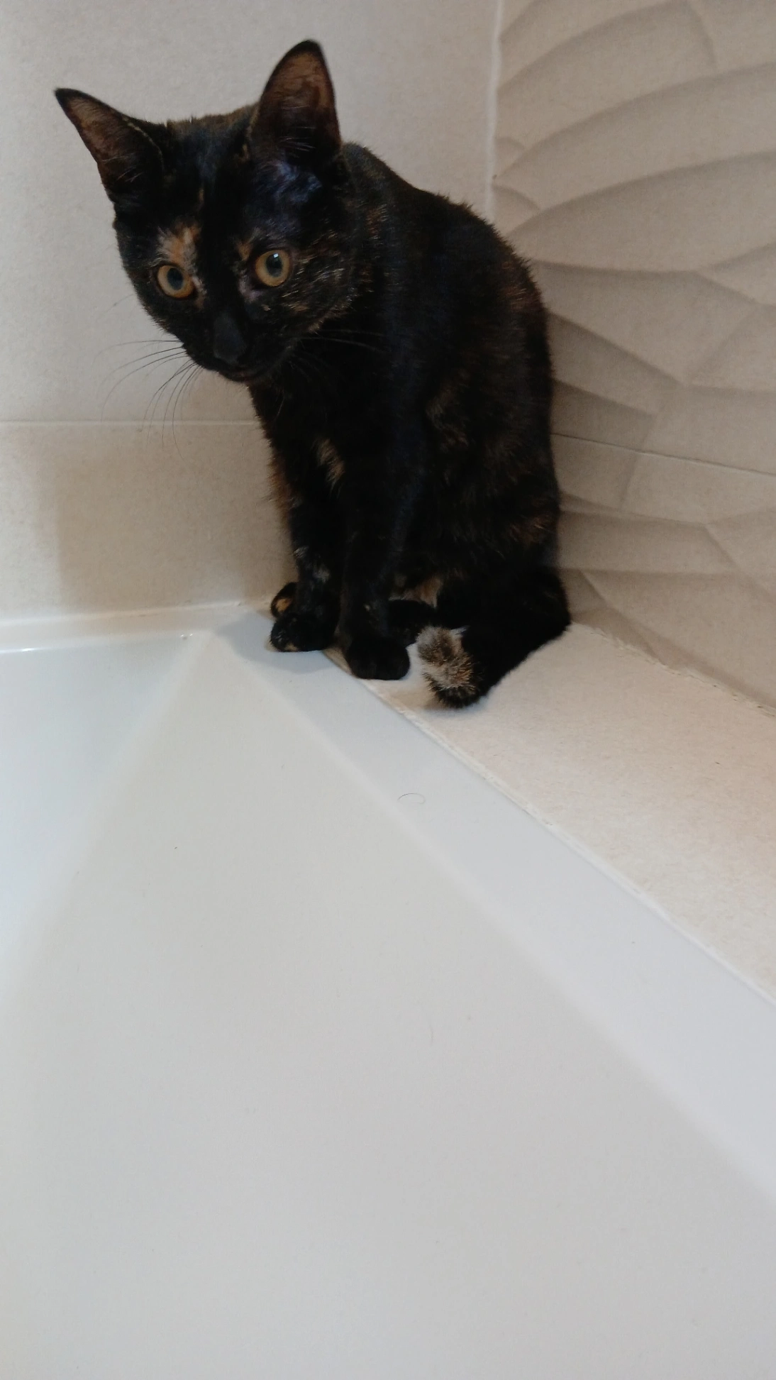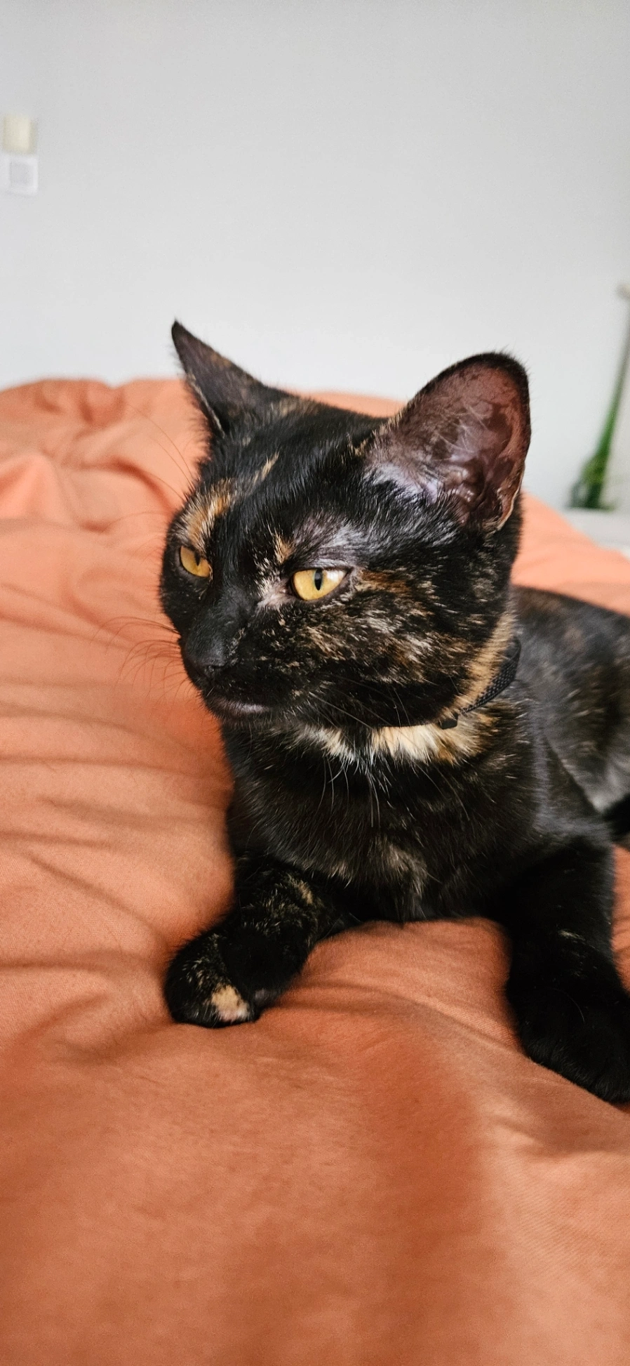 Jeune chatte écailles de tortue (noir avec des taches rousses). Porte un collier.