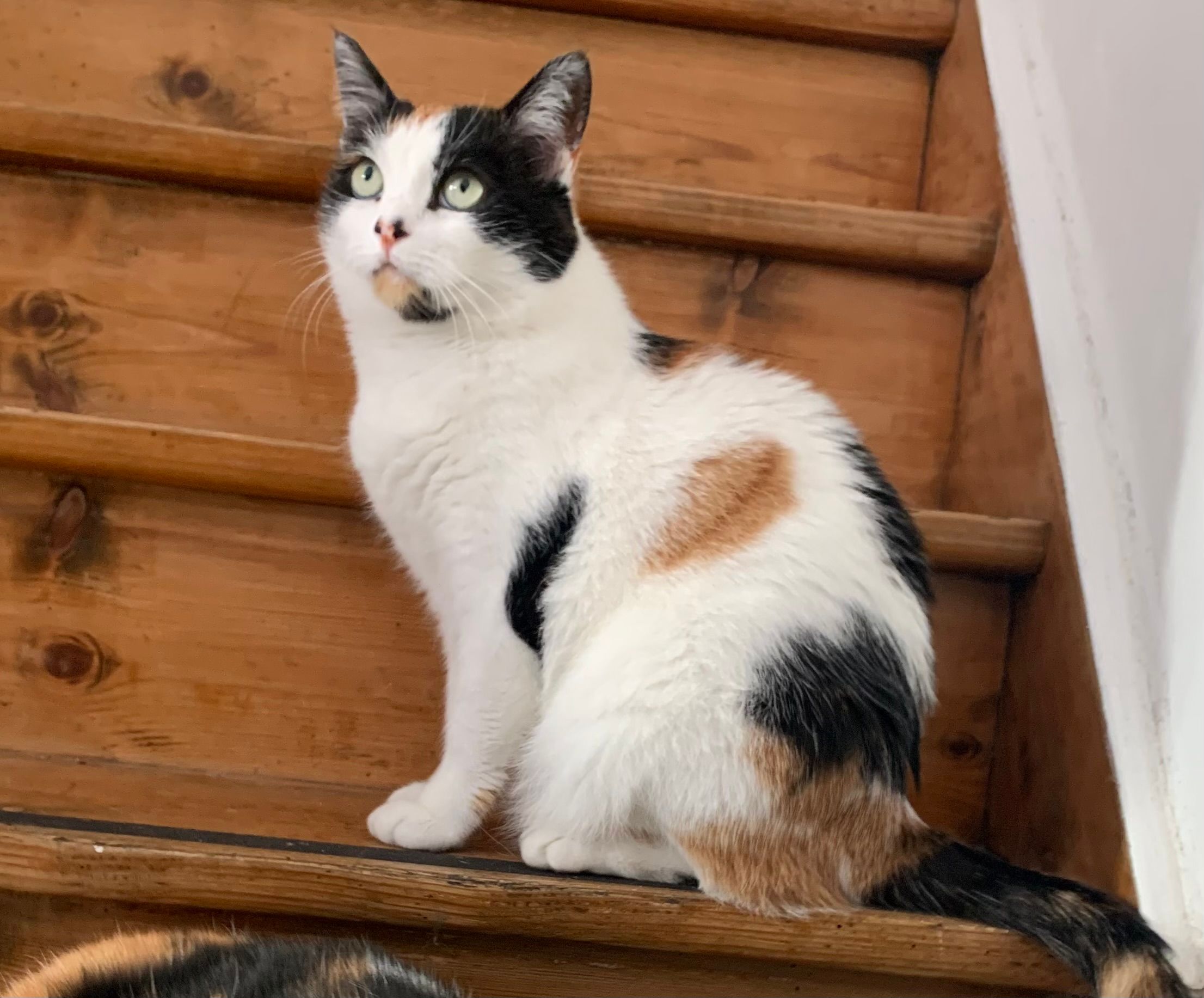 Craintive, femelle de 5 ans, pas pucée ni tatouée, 3 couleurs noir blanc marron