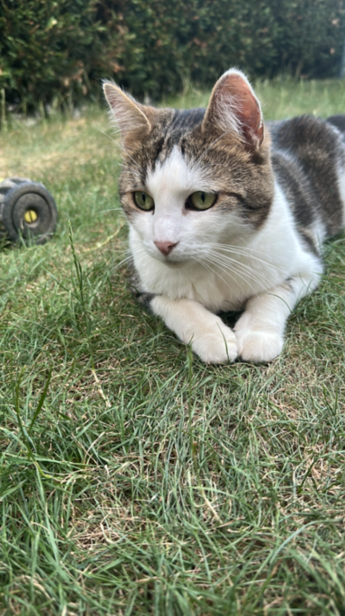 Femelle de 4 ans stérilisée, tigré et blanche.