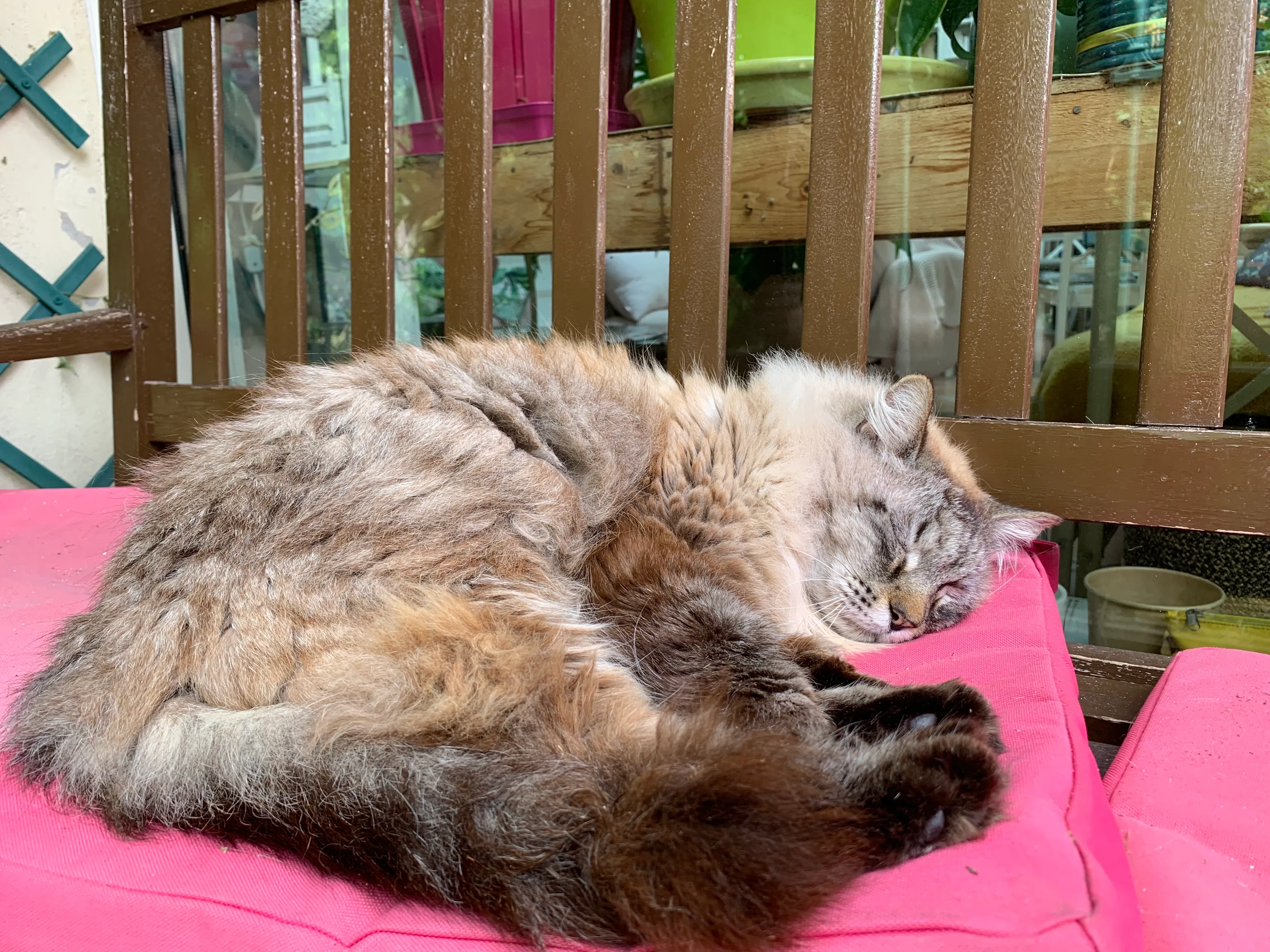 Chat de race Européenne, couleur beige yeux bleus, corpulence gros, peureux, n'a pas l'habitude d'être dehors.