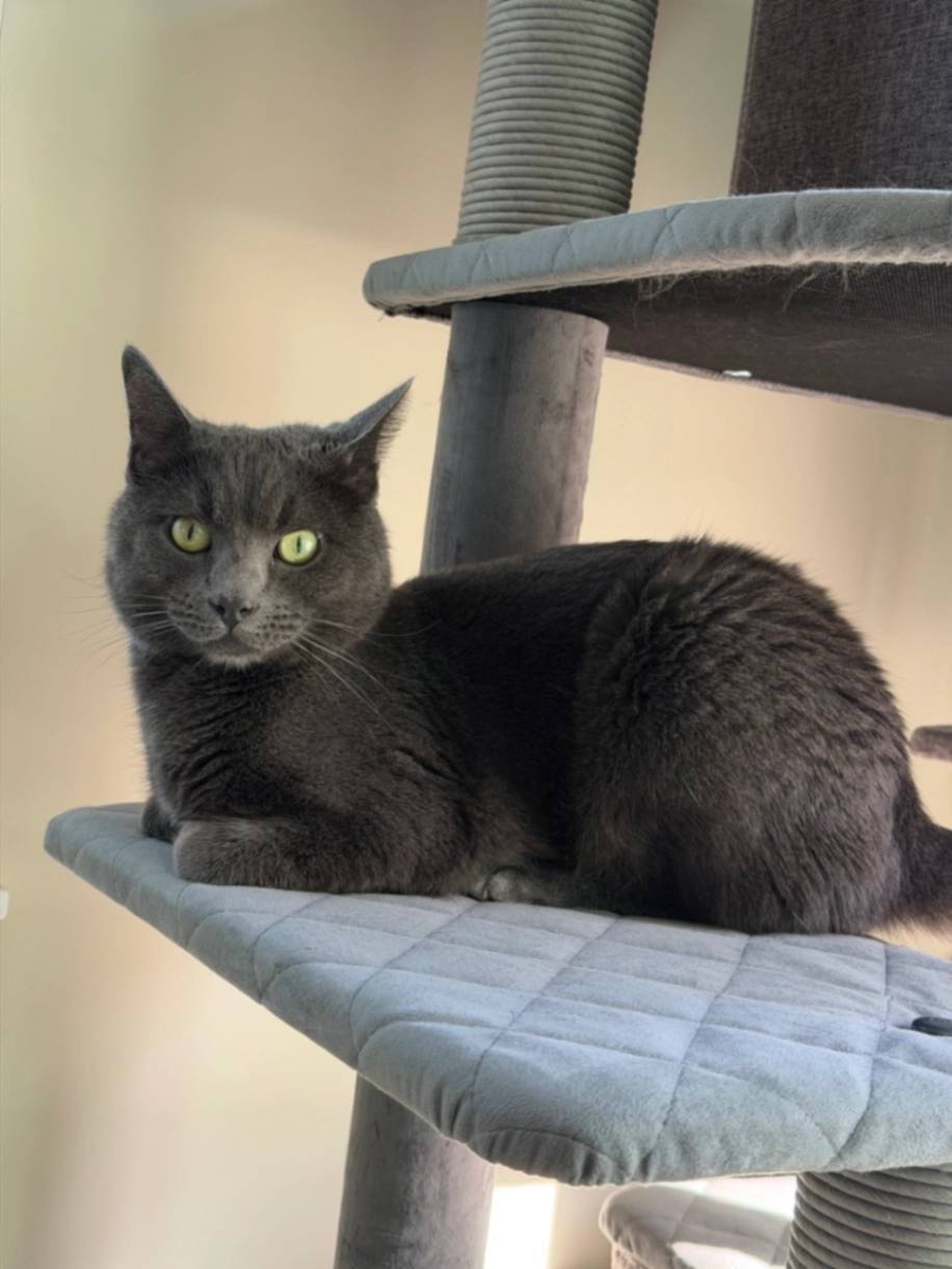 He has a bluish gray coat, yellowish green eyes, and friendly with people. He is an indoor cat. He’s scared of small kids.