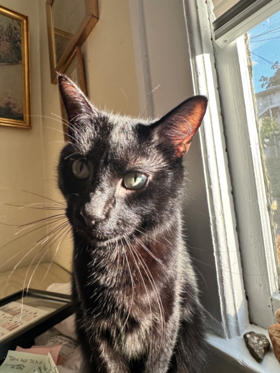 Black Short-haired cat with Green eyes and a teal collar with sushi on it.