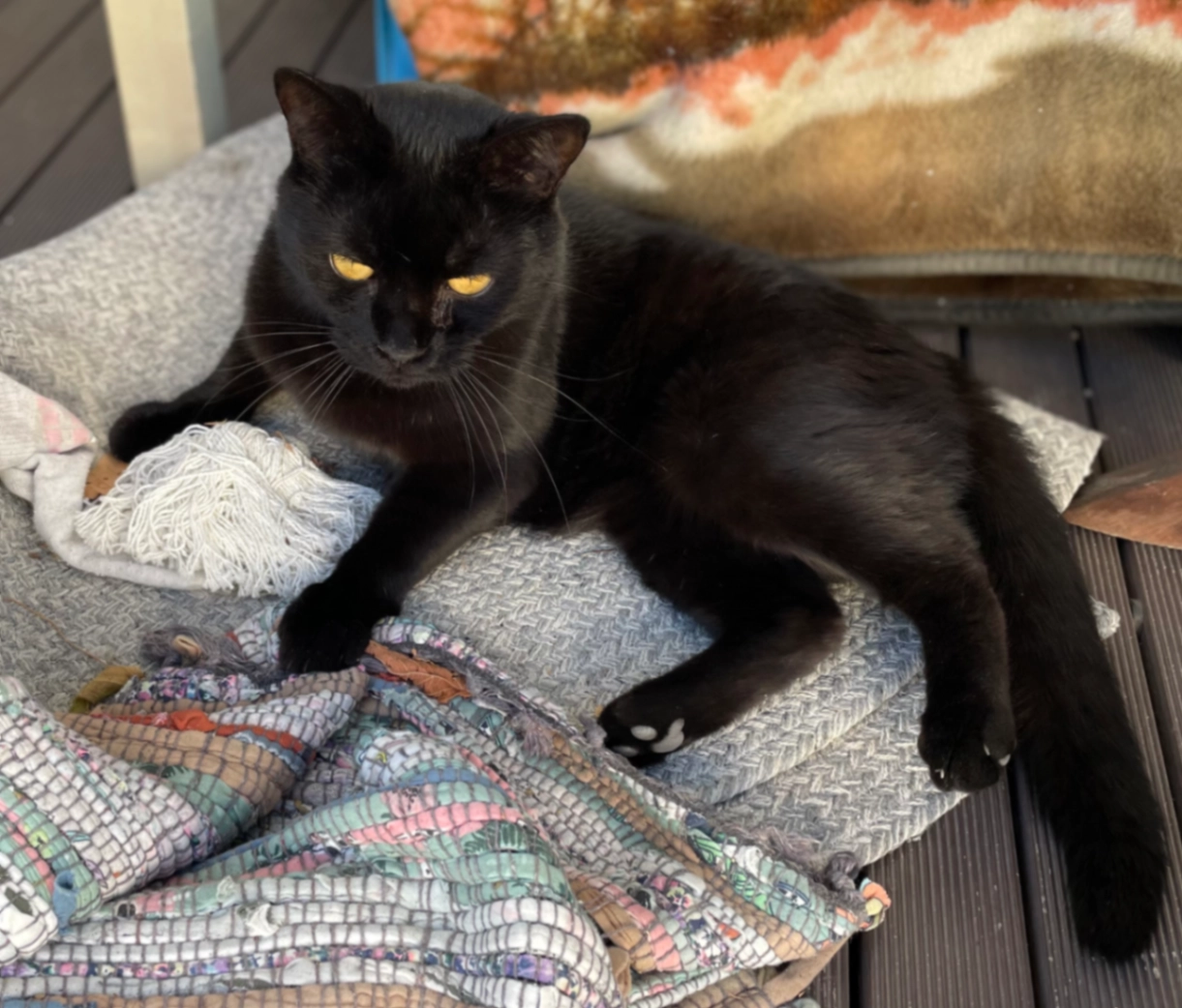 Black domestic short hair male, no collar. Yellow eyes (left eye is teary). Microchipped, registered, desexed. Staying far from home with a friend and escaped 2 January.