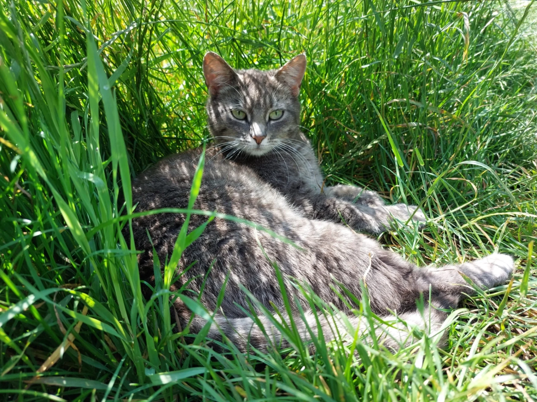Adi est une petite femelle grise tigrée (tachetée sur le ventre) aux yeux verts. Elle est puçée mais n'a pas de collier