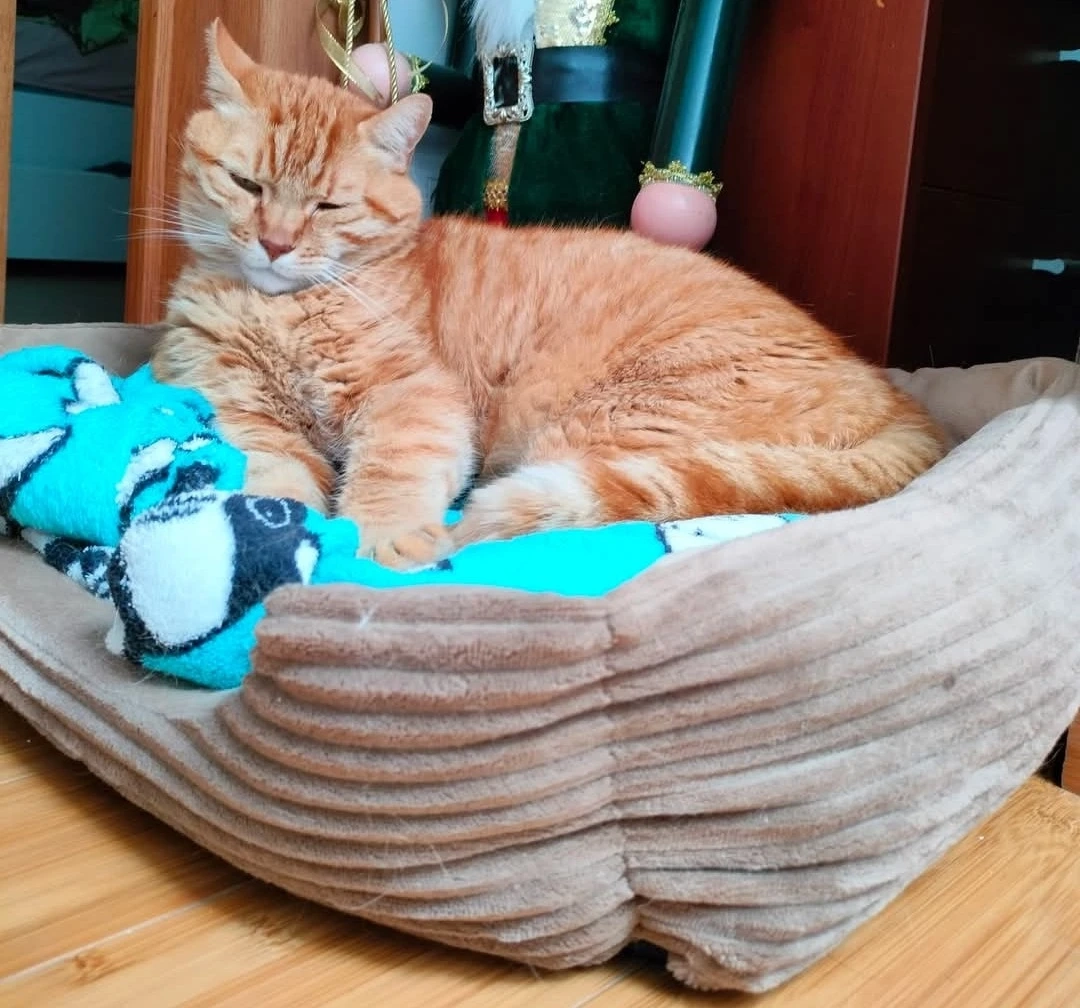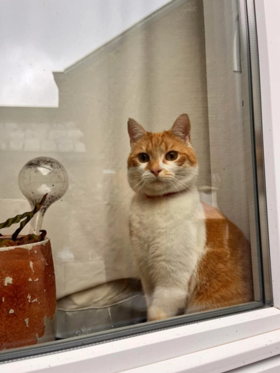 Chat roux et blanc, collier gris, une entaille à l’oreille