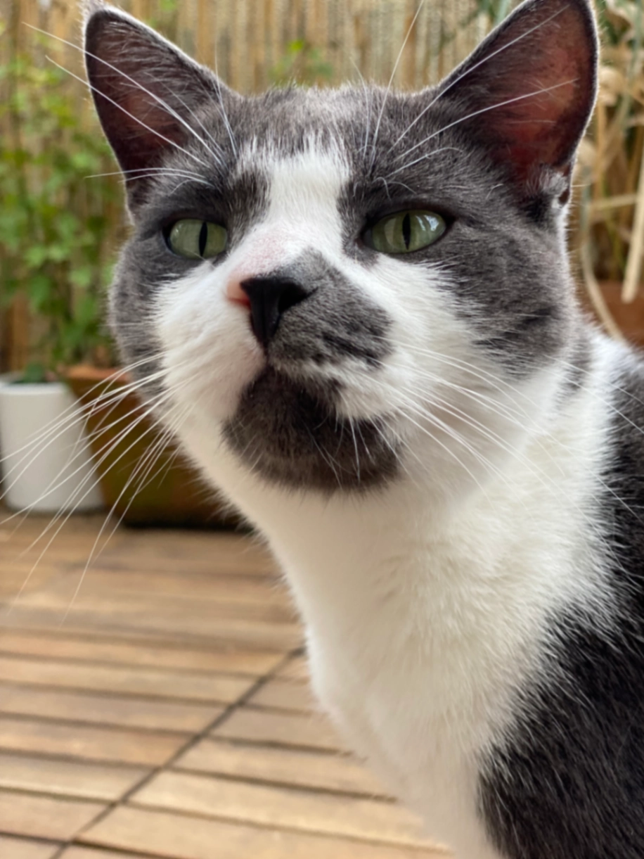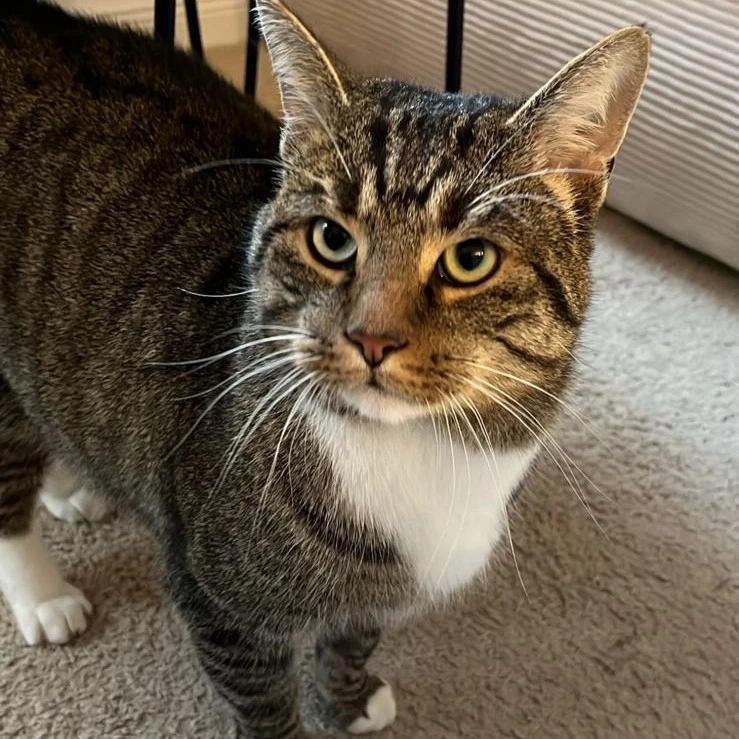 Er ist ein aufgeweckter, normalerweise sehr zutraulicher grau getigerter Kater mit weißer Brust, weißem Kinn, weißen Vorderpfoten und weißen Hinterbeinen.