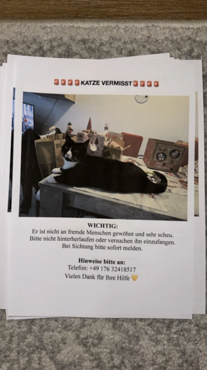 Es geht um eine Mitze die er vermisst. Sie heißt Miu und wird seit 11.09.25 vermisst. Sie wurde auf der Wenzel-Verner-Str rausgelassen. Sie ist Freigänger. Sie ist nicht gechippt und noch nicht stilirisiert. Ich möchte auch keine Kommentare hören das man unkastriete Katzen nicht raus lassen darf. Ich suche die Katze und und keine Beratung von Kastration. Sie hat auch ein Bruder der sie auch sehr vermisst Zuhause.