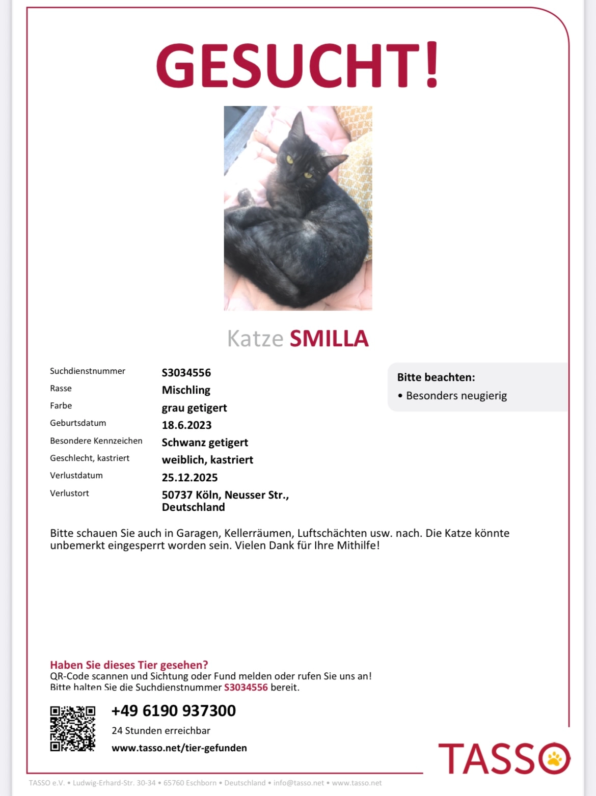 Jeder noch so kleine Hinweis könnte helfen, dass unser geliebtes Tier wieder nach Hause findet.