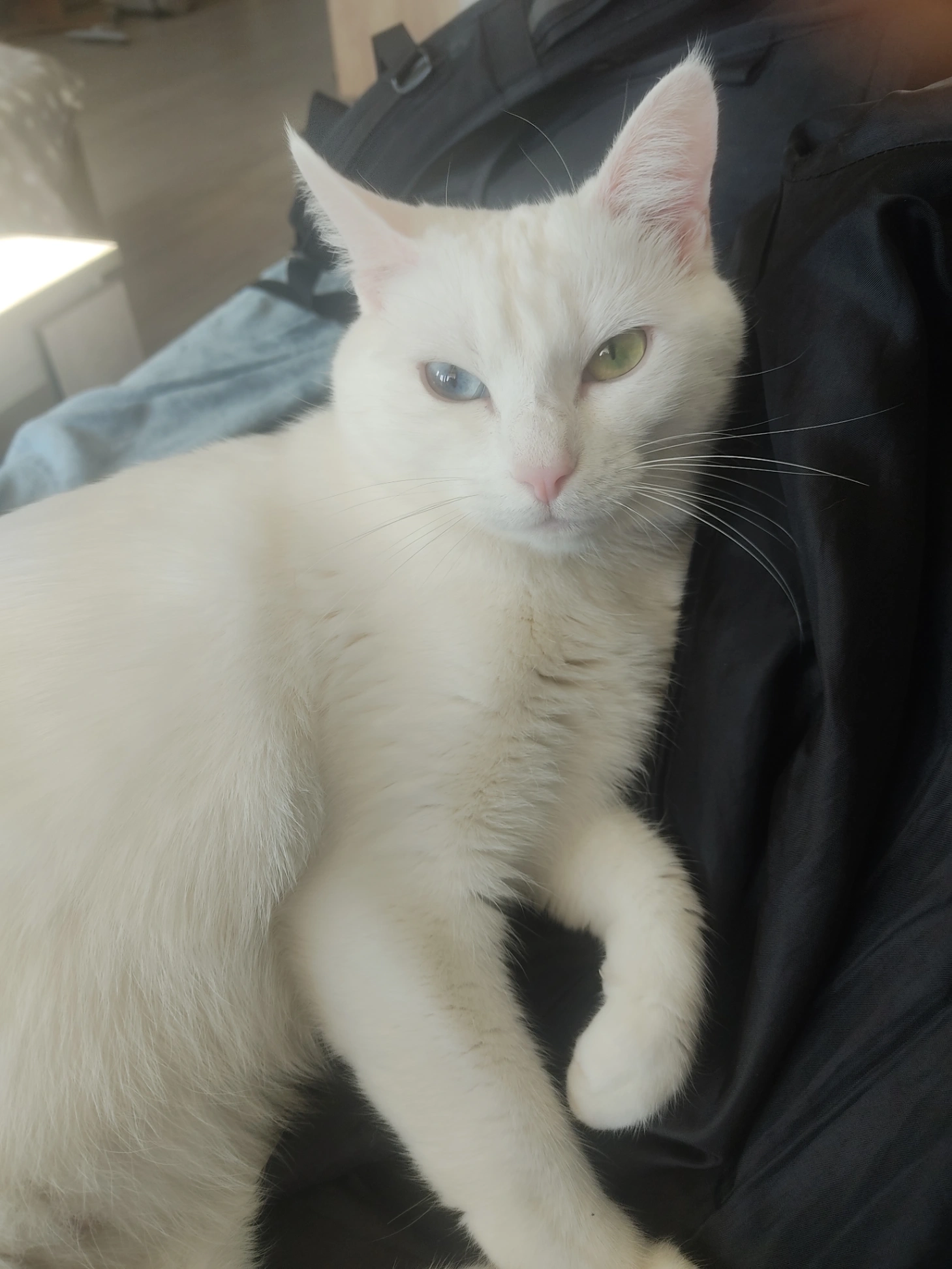 Matcha est une femelle toute blanche avec les yeux vairons. Elle est craintive et pas agressive. Elle est stérilisée et pucée.