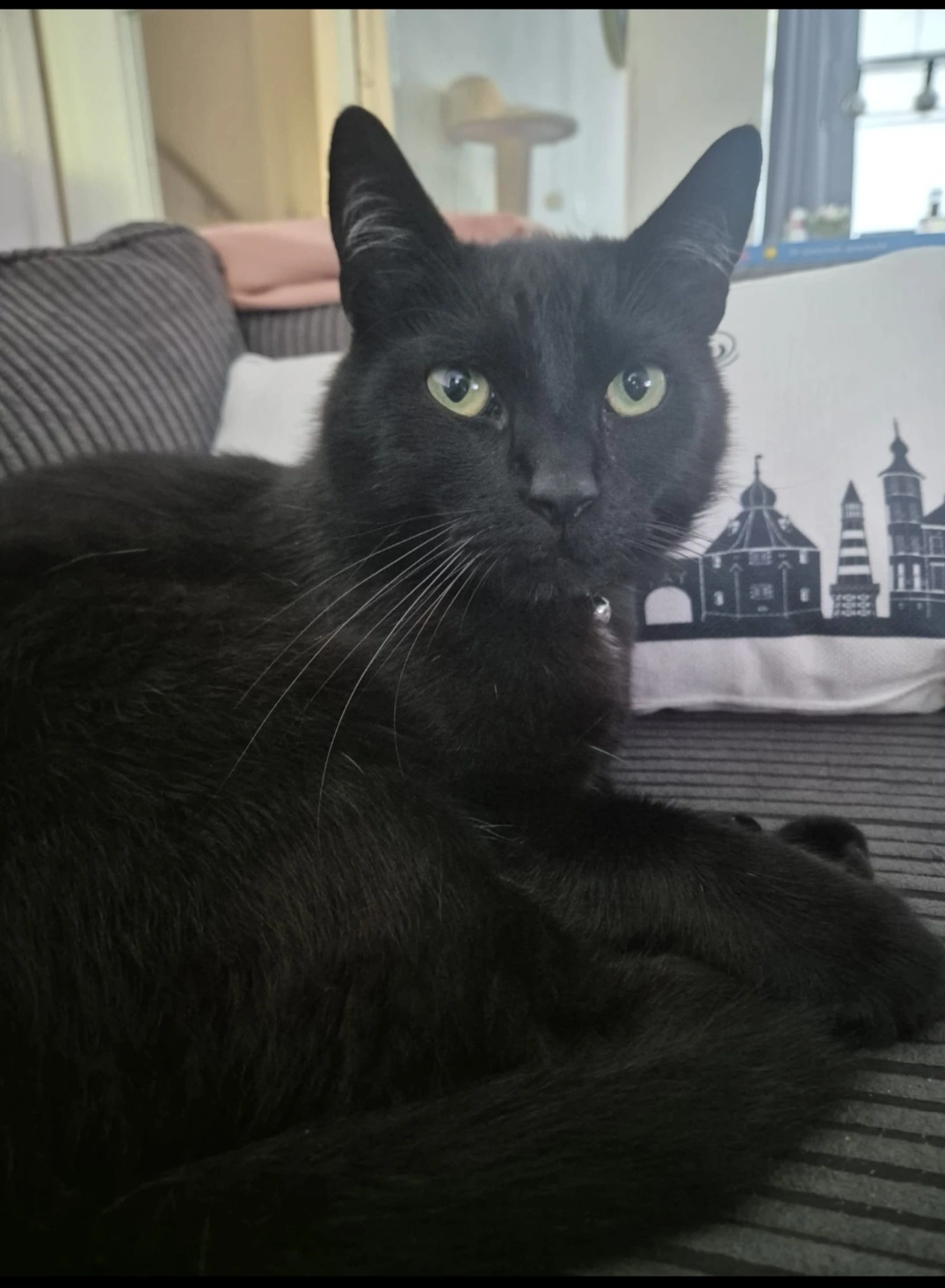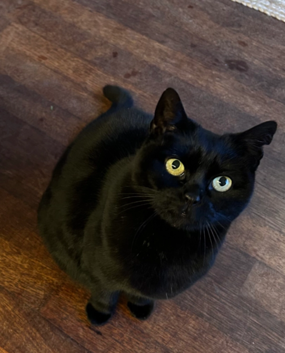 Sociale, lekkere dikke kat. Luistert goed naar de naam Blitz of Blitzie, gek op snoepjes. Beetje witte plukjes in zn oortjes en op bef, verder helemaal zwart. Wordt heel erg gemist.