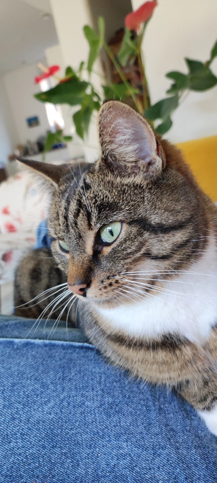 Lieve poes die er uitziet als een tijgertjes dus grijs met beige en wit. Witte pootjes. Ze is niet klein maar medium qua grootte. Eigenlijk zoals de meeste poezen.