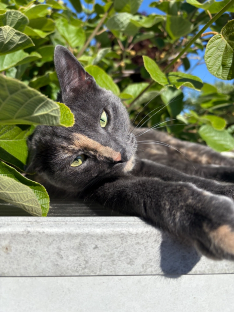 Zwart grijze kat met een licht bruine streep over haar gezicht
