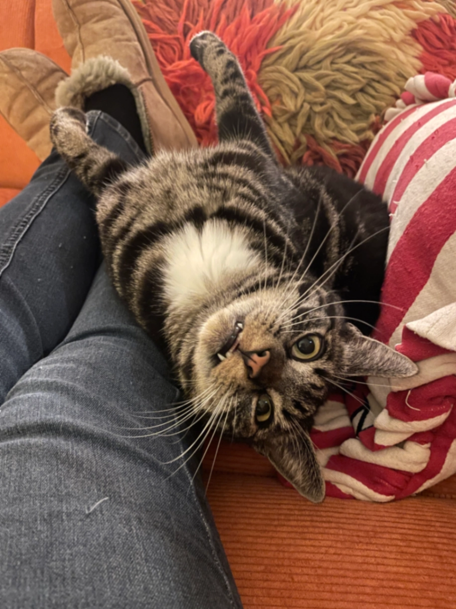 Rood/wit cypers. Hoofdzakelijk rood gestreept. Witte snoet met een rossig snorretje en een klein rood vlekje rechts. Witte bef en borst. Wit uiteinde van de pootjes. Cypers gestreepte staart. (forse kat)
