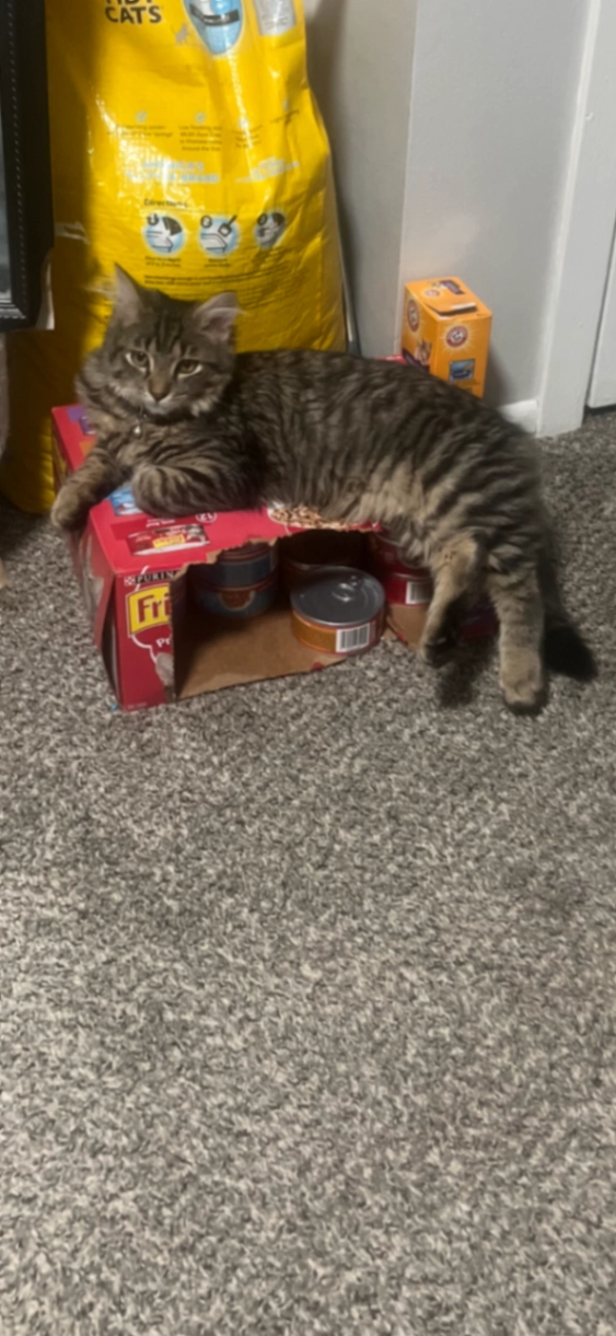 Milo is 8 months old he is still a kitten but on the bigger side he isn’t fixed. He is afraid of strangers but very food motivated if you have food he will come! He is very friendly if you see him please grab him up and contact me