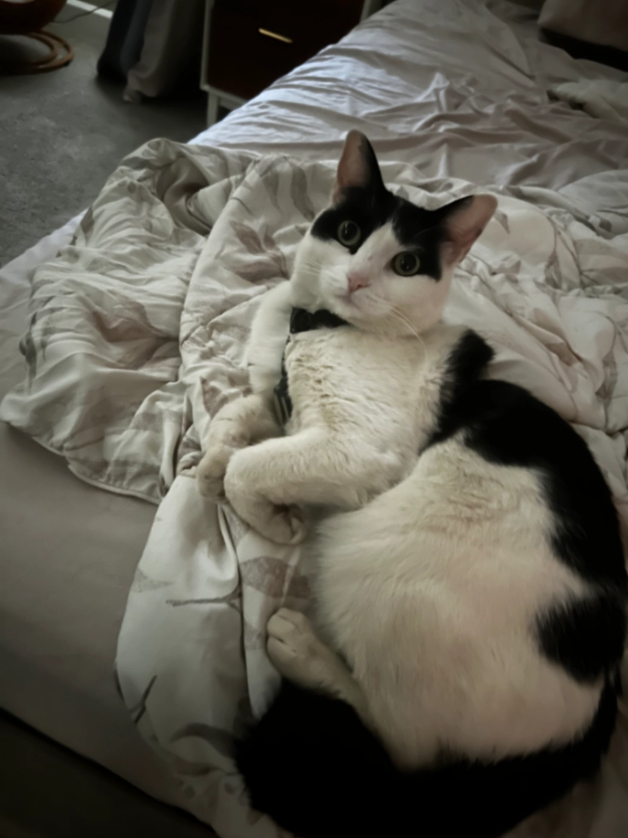 Luna is a 4 year old female, black and white. She is very soft and very shy. Her meow is very quiet. She is wearing a harness, a name tag, and an air tag.