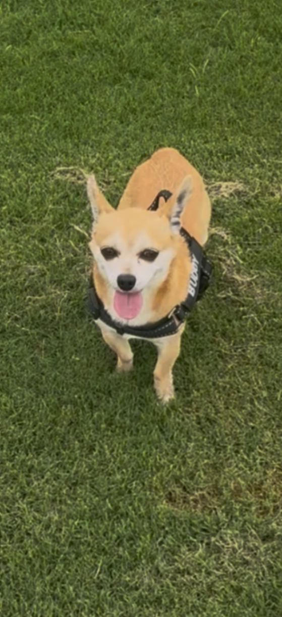 Blonde fur, chihuahua x Maltese has a black bald spot on top of his head