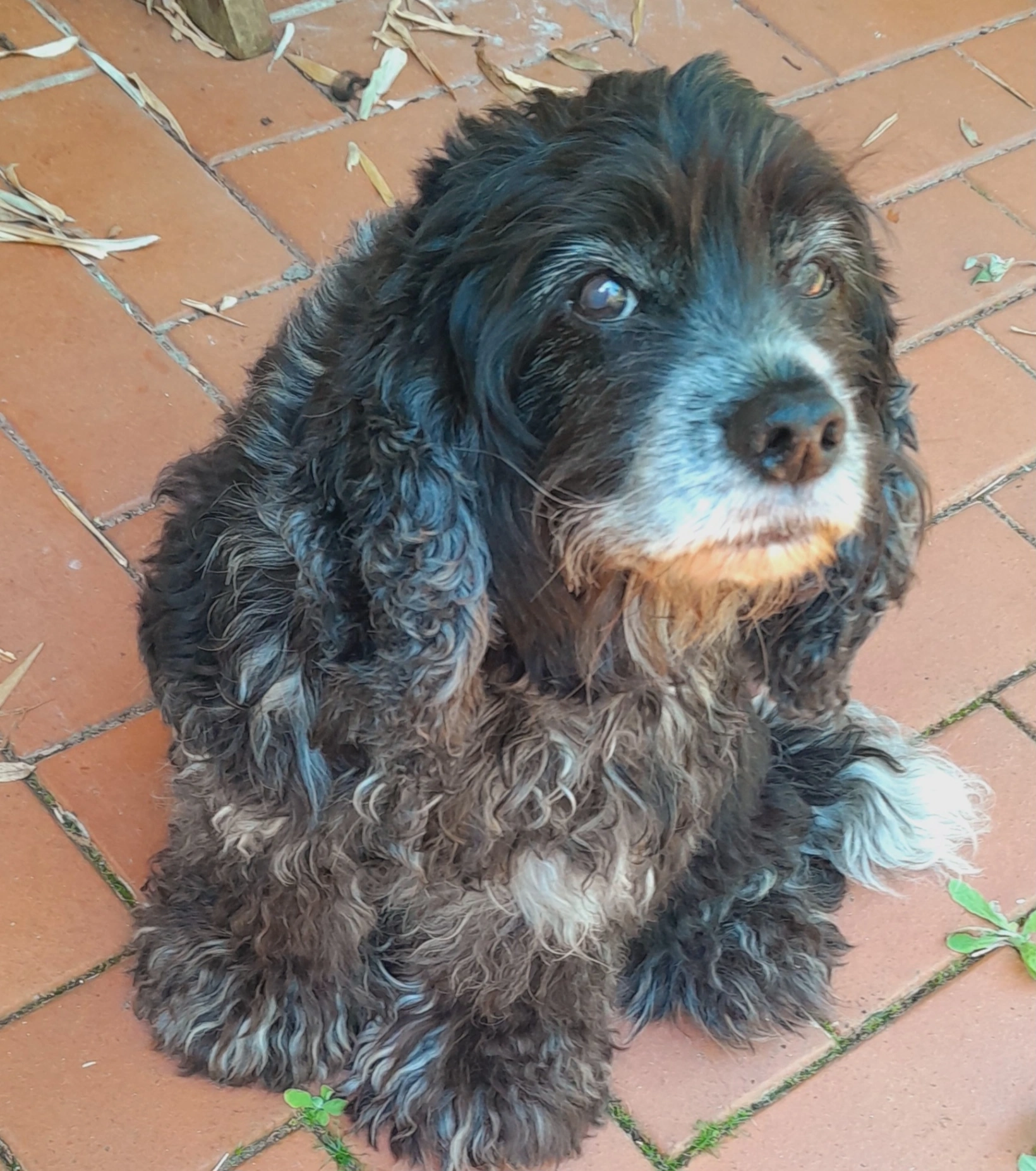 Old ,eye sight glassy, black and white,grey coca spaniel/ Caveah