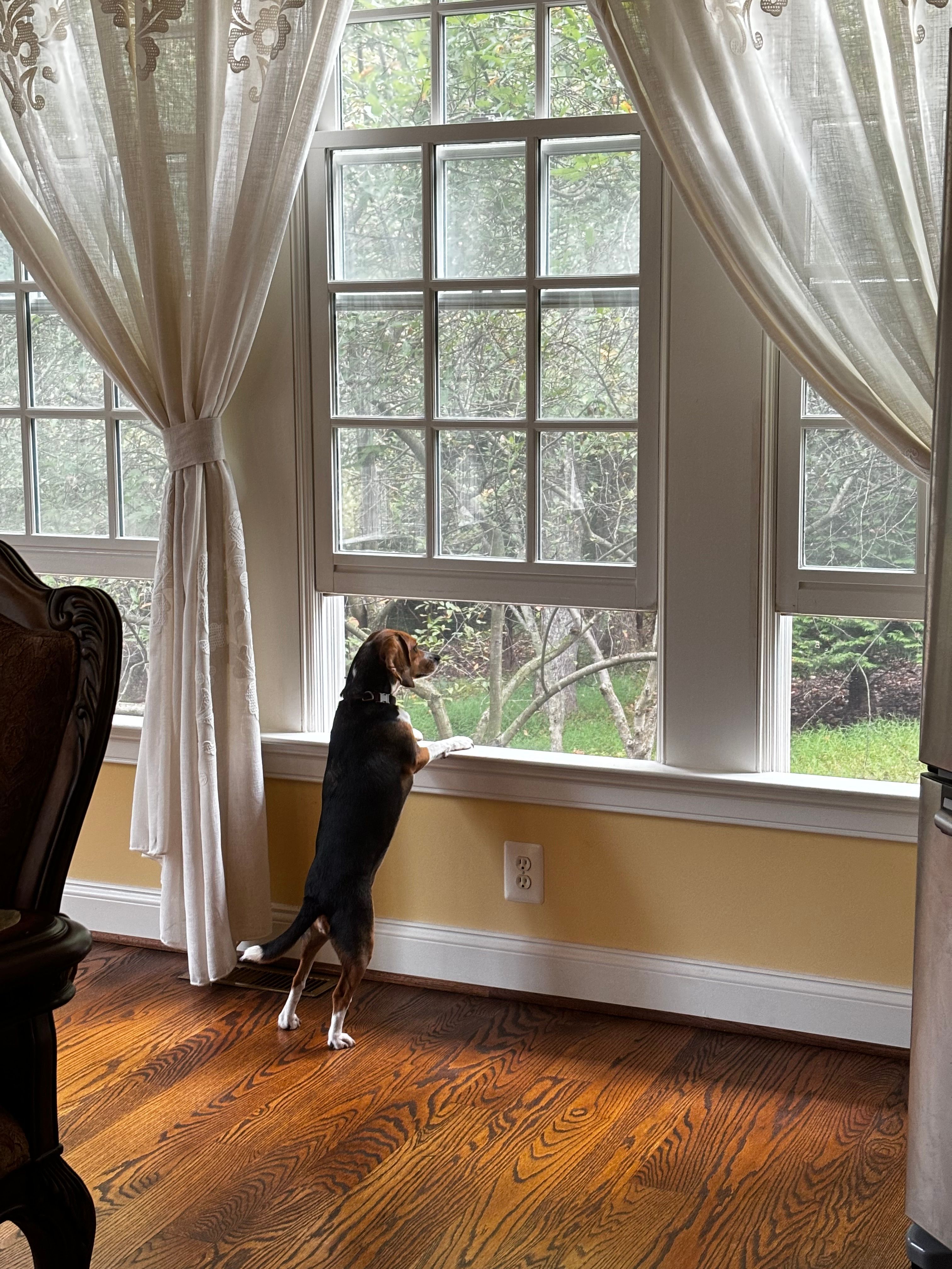 Rover runs away this morning from our house. She runs into the woods, we can hear her barking but cannot locate her and hind her. She is a small beagle, with a red collar on her.
