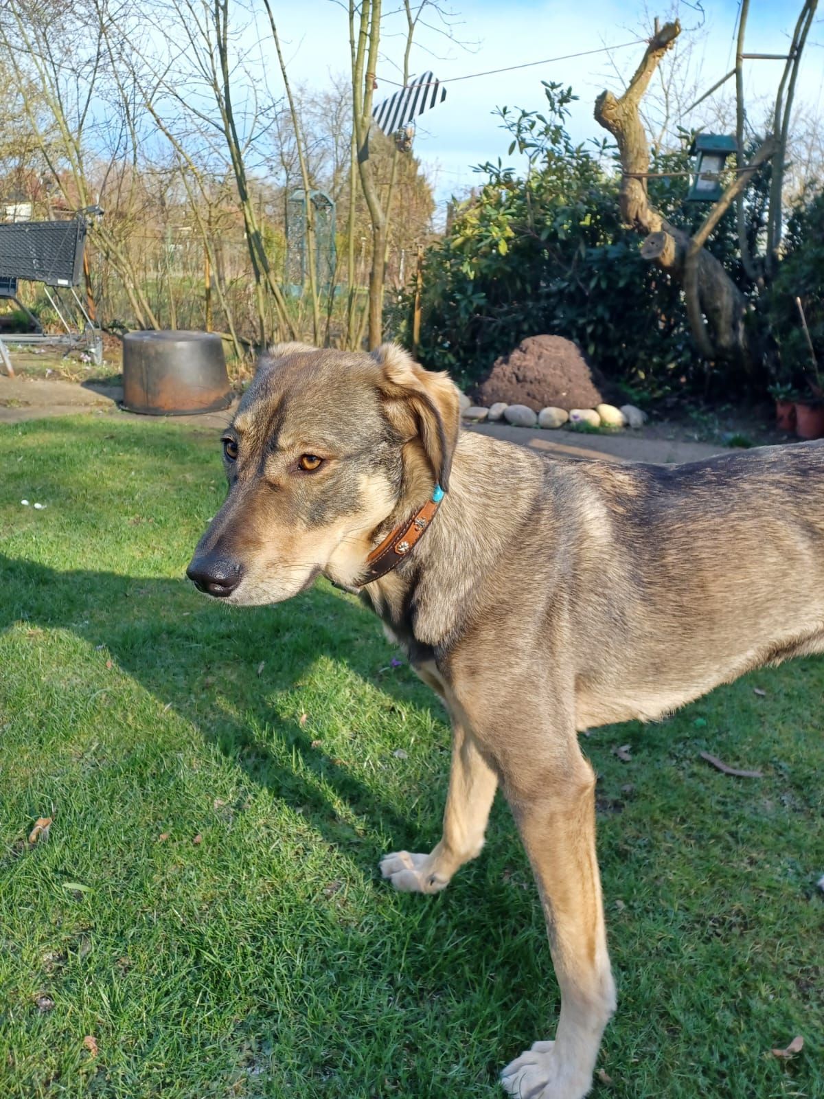 Mischling, sieht aus wie ein kleiner Wolf. Trägt einen Transponder