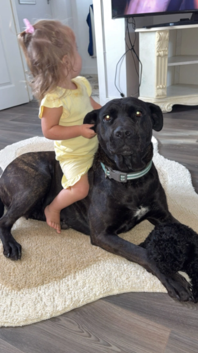 She is a cane corso cross black with brindle across a white patch on her chest and I believe she is wearing a pink collar