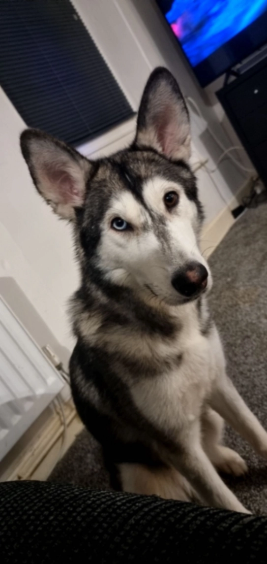 Siberian husky. Little heavier than in the photo. Friendly with people and children but can be aggressive towards over animals after several bad experiences with other dogs. Bi coloured eyes one blue and one brown.