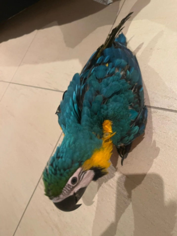 Blue and gold macaw, around 4 months old.