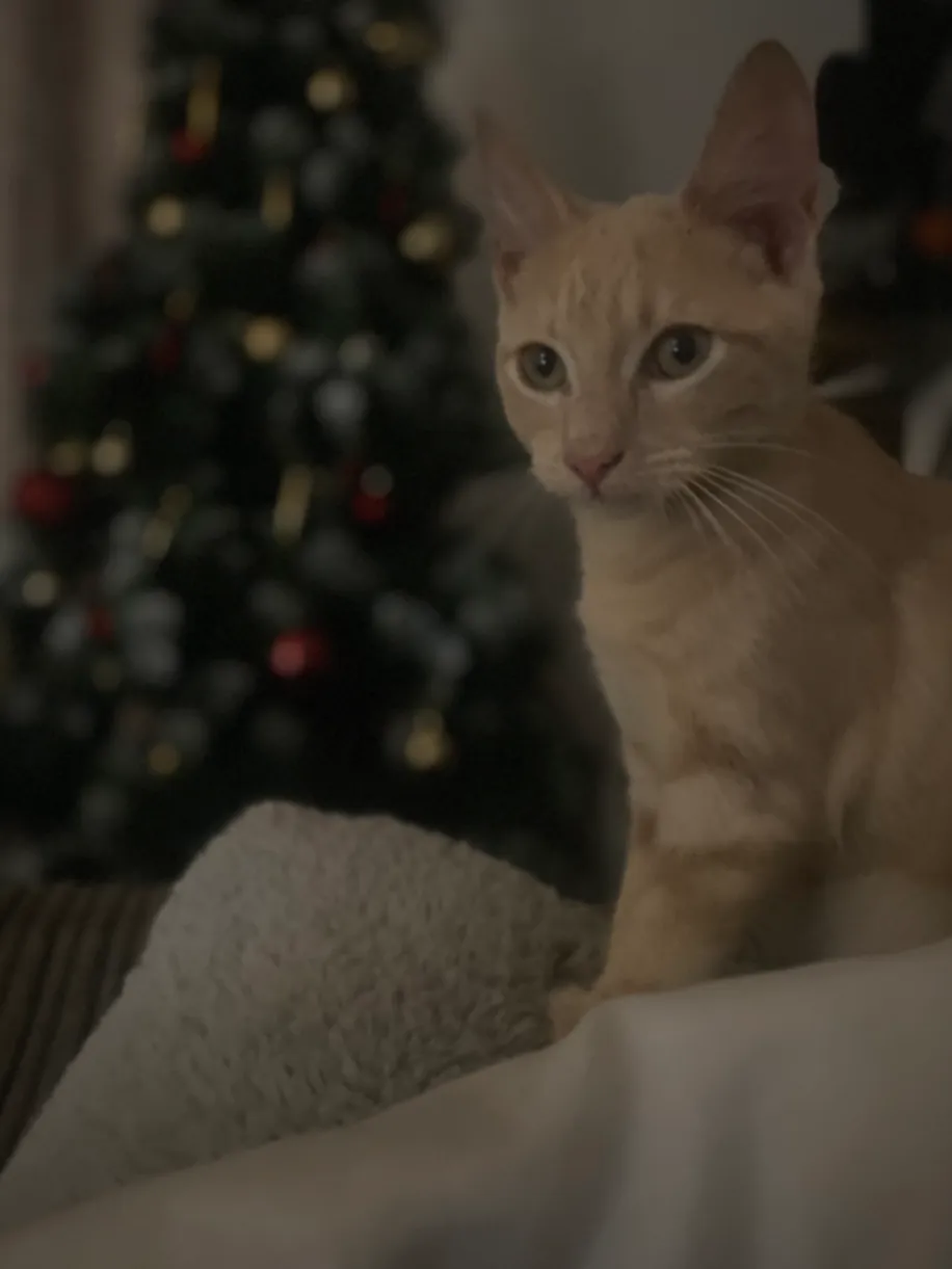 Simba is a really fair ginger cat light in colour white beige/light stripes. distinctive swirly striped patterns all over his body , he is a very small cat as he is still a kitten.