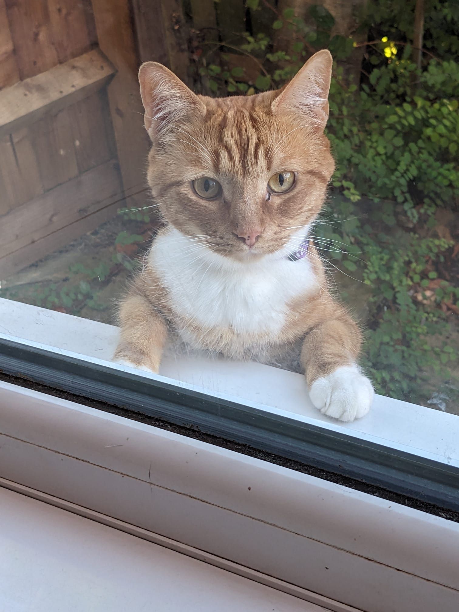 Neutered male 4yrs. Ginger tabby and white. Chipped and was wearing a purple collar.