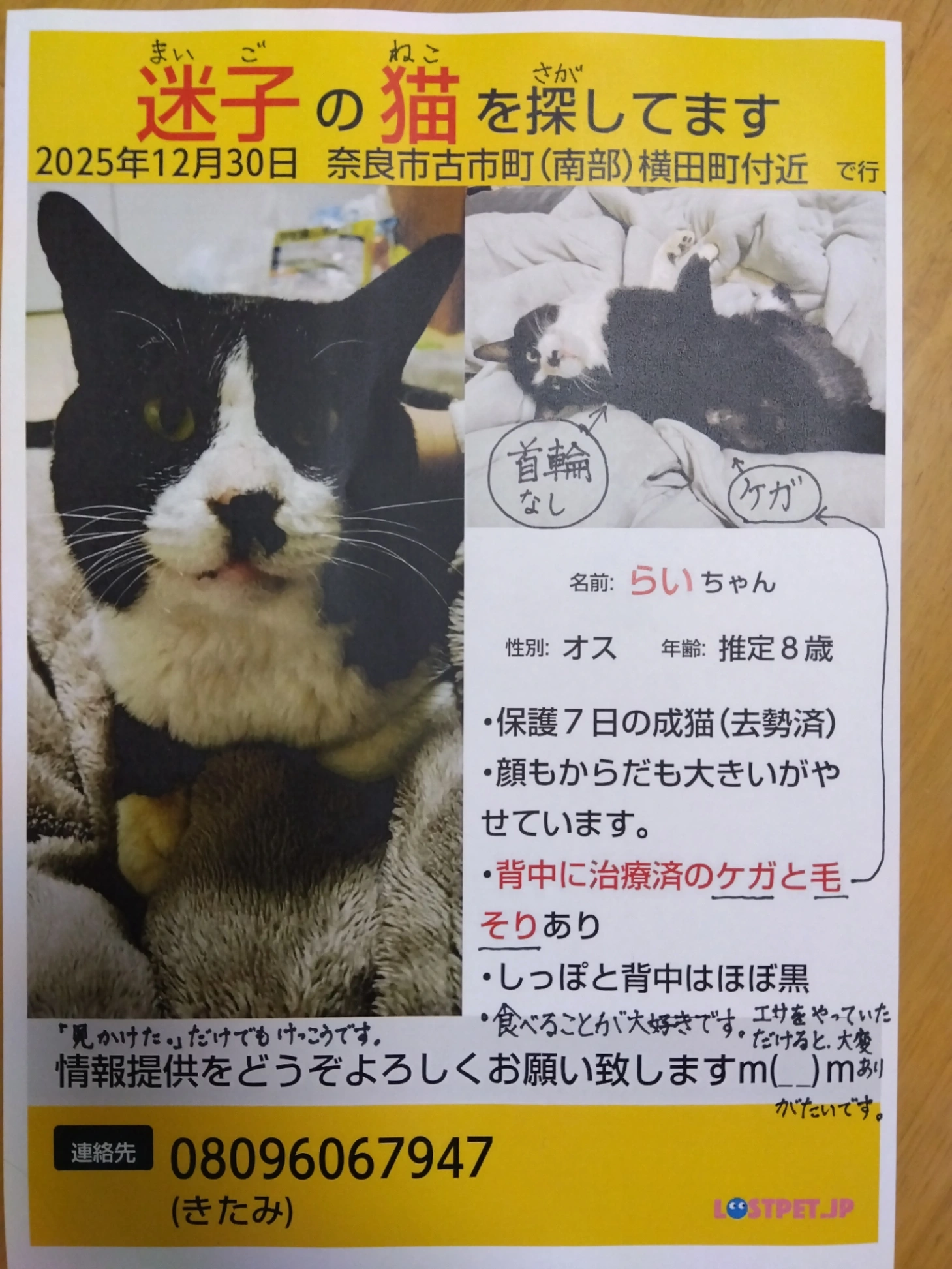 たくみ再会までにかかった時間:1カ月地域の方に告知するのに苦慮しました。ポスターを貼ったら警察に叱られもしました。 たまにいただく、メールも猫探しのアイデアになりました。できたら毎日欲しい。励ましてくださることが力になります。みなさんの一言が探す力になります。ありがとうございました!