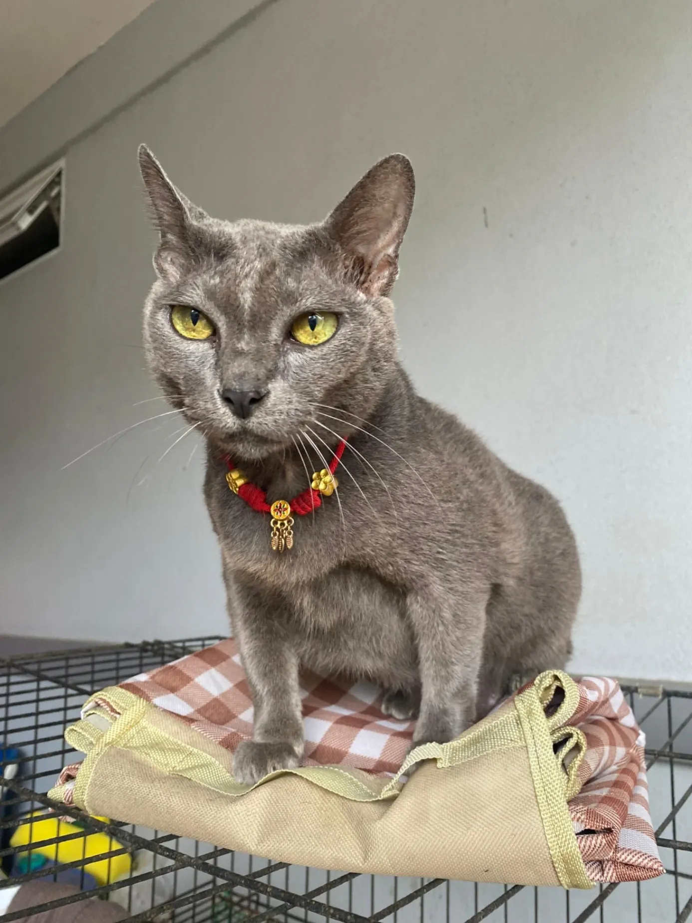Wearing a yellow collar(Bandana) with a Stitch(from Lilo & Stich) bell. He is a deaf cat