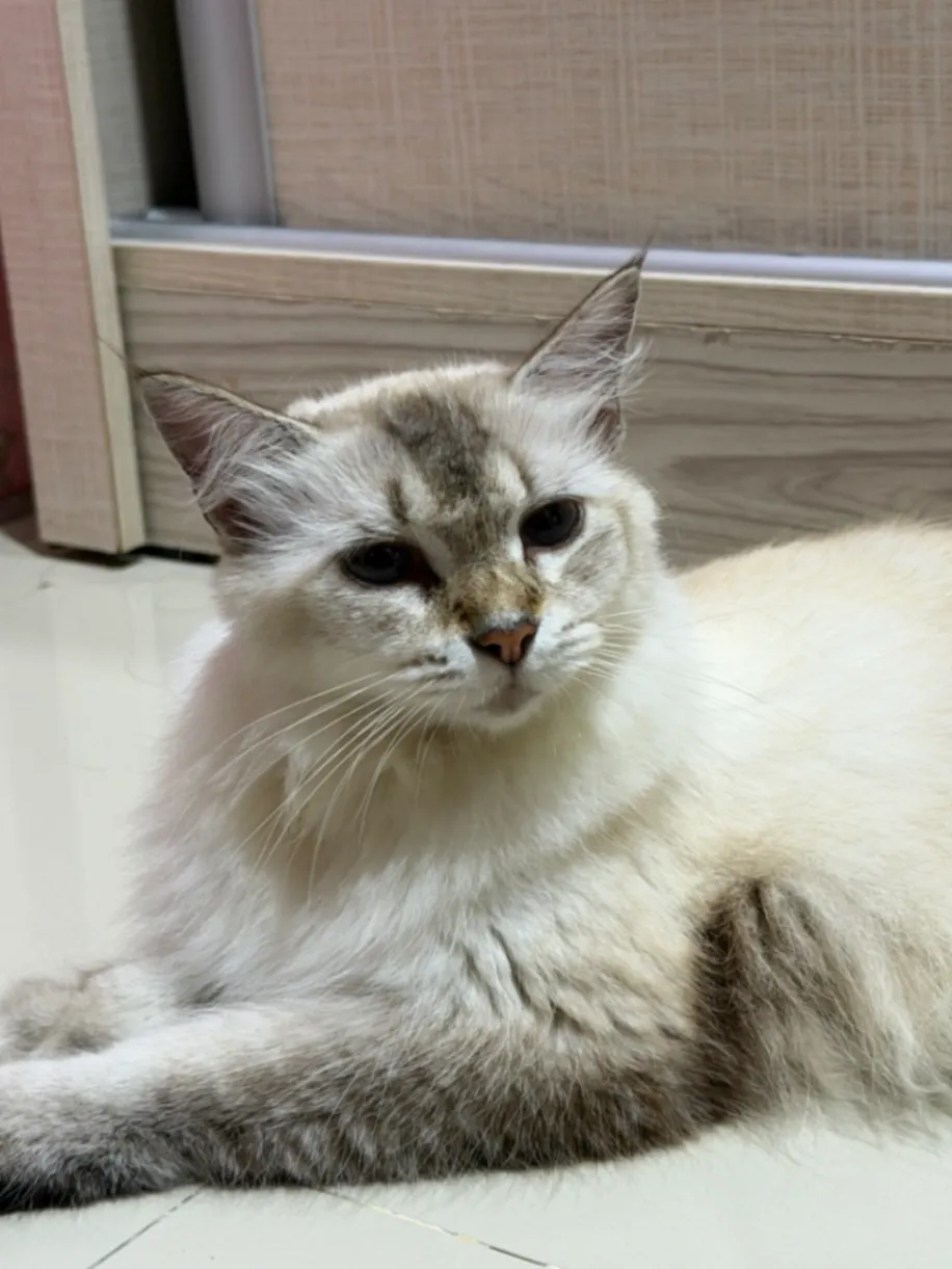 Female cat. White with brown paws & ears. She has sensitive skin, can’t be outdoor for too long or else she’ll get rashes all over her body.