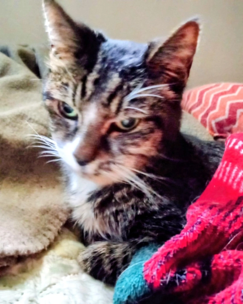 ISIS is small, about 10 years old, and shy. She is what I think people call a tabby. Mostly gray, but also white, black, a little goldish brown.