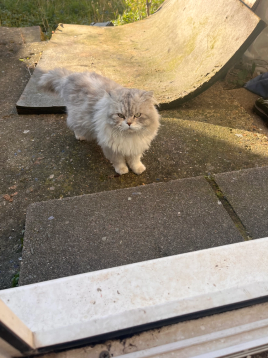 Long haired grey male cat name unknown keeps coming to beg for food including in the middle of the night used to have a pink collar but it’s missing