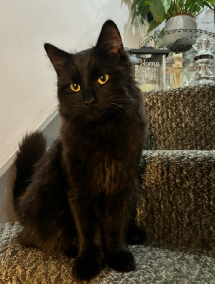 Panther is an over friendly, loving kind soul, he has the odd few silver/grey hairs and in the light a tinge of red. He has a distinctive slice on his left ear. He is fairly long haired. He is just over a year and had old.