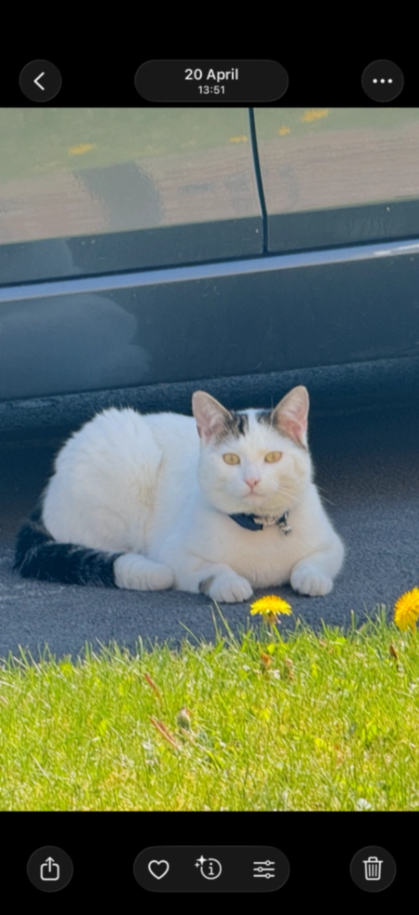 Grey and white tabby cat, mainly white on her chest, small dainty cat. 1 years old